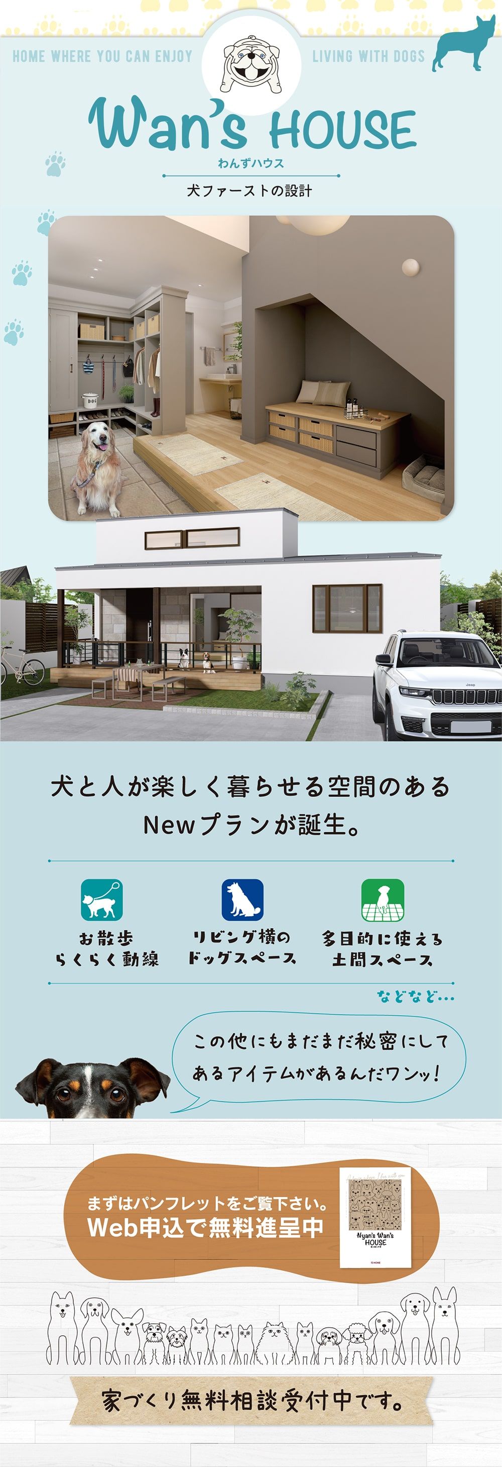 モフモフたちに癒やされながらともに幸せに暮らす【にゃんずわんずハウス】が誕生。家族みんなが幸せに暮らせる家づくりをお考えの方にパンフレットを差し上げます。まずはお気軽にお問い合わせ下さい。