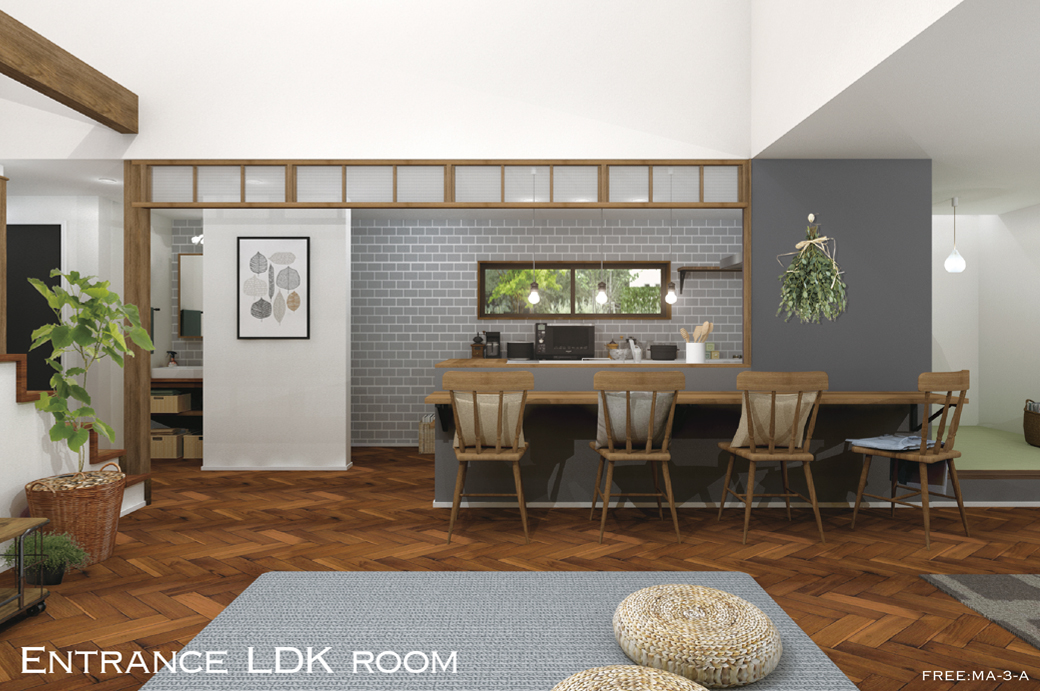 玄関ホールをあえてなくし、ドアを開けると目の前に飛び込んでくるのはLDK。