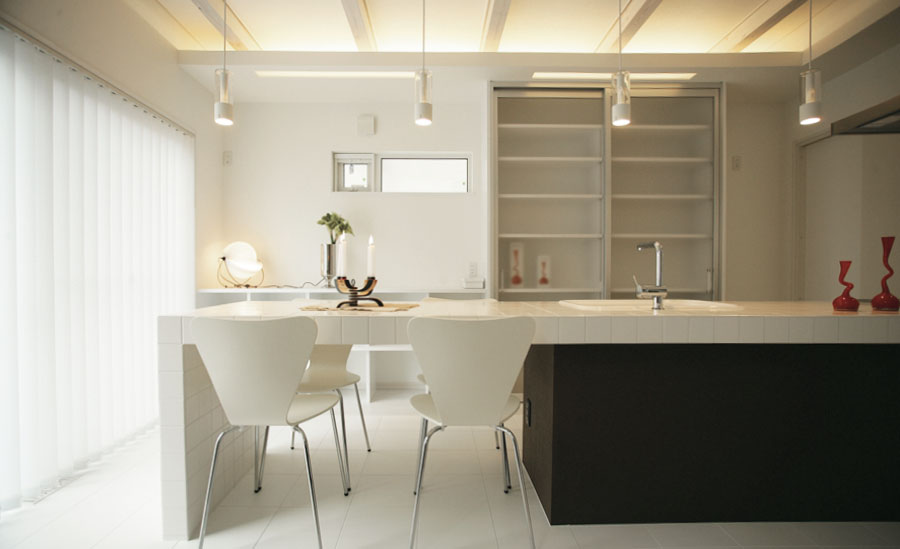 開放的でありながらも,リビングやダイニングに座る位置で、さりげなく目線が遮られる、落ち着いて寛げる空間です。 キッチン横の、勝手口と脱衣室に繋がる動線は、毎日の忙しい家事もスムーズな流れで快適に使う事が出来ます。