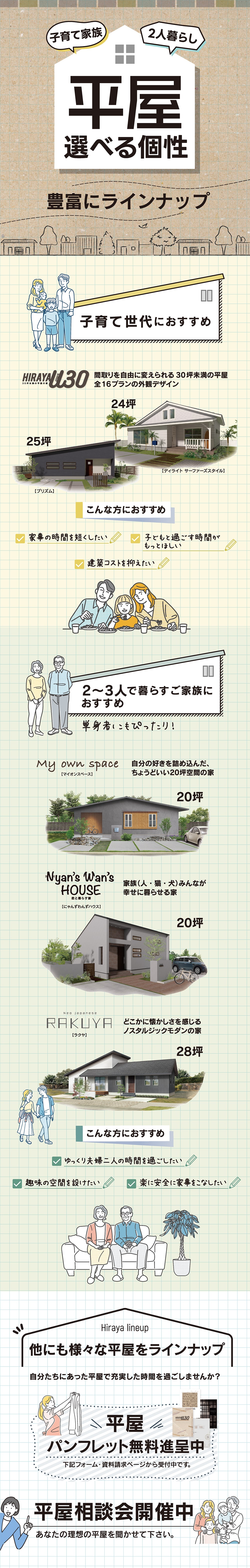 TDホームではお客様の暮らし方に合わせた平屋を、個性豊かにラインナップ。子育て世代のご家族も、2〜3人で暮らすご家族にもぴったりのプランを多数ご用意しております。自分たちにあった住まいで充実した時間を過ごしませんか?こだわりの家づくりをお考えの方、ご興味のある方、まずはお気軽にお問い合わせ下さい。建てたい平屋のプランニングと資金計画を無料で致します。
