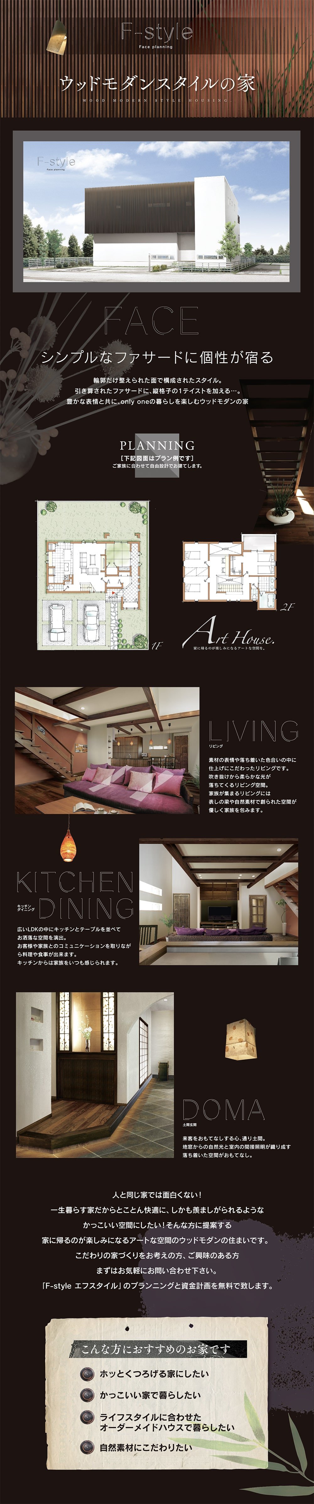 一生暮らす家だからとことん快適に、しかも羨ましがられるようなかっこいい空間にしたい!そんな方に提案する、家に帰るのが楽しみになるアートな空間のウッドモダンの住まいです。 こだわりの家づくりをお考えの方、ご興味のある方、まずはお気軽にお問い合わせ下さい。「F-style エフスタイル」のプランニングと資金計画を無料で致します。